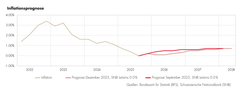 Entgegen den Erwartungen der SNB nahm jedoch der Inflationsdruck in den letzten Monaten etwas ab. Sie verweist jedoch an der Lagebeurteilung vom Dezember darauf, dass der mittel- bis langfristige Inflationsdruck im Vergleich zum September praktisch unverändert ist. Die prognostizierte Inflation verbleibt – auch wenn sie in der kurzen Frist aufgrund des abgenommenen Inflationsdruckes etwas unterhalb der Prognose vom September zu liegen kommt, im gesamten Prognosezeitraum innerhalb des Zielbandes der SNB von 0 bis 2 Prozent.